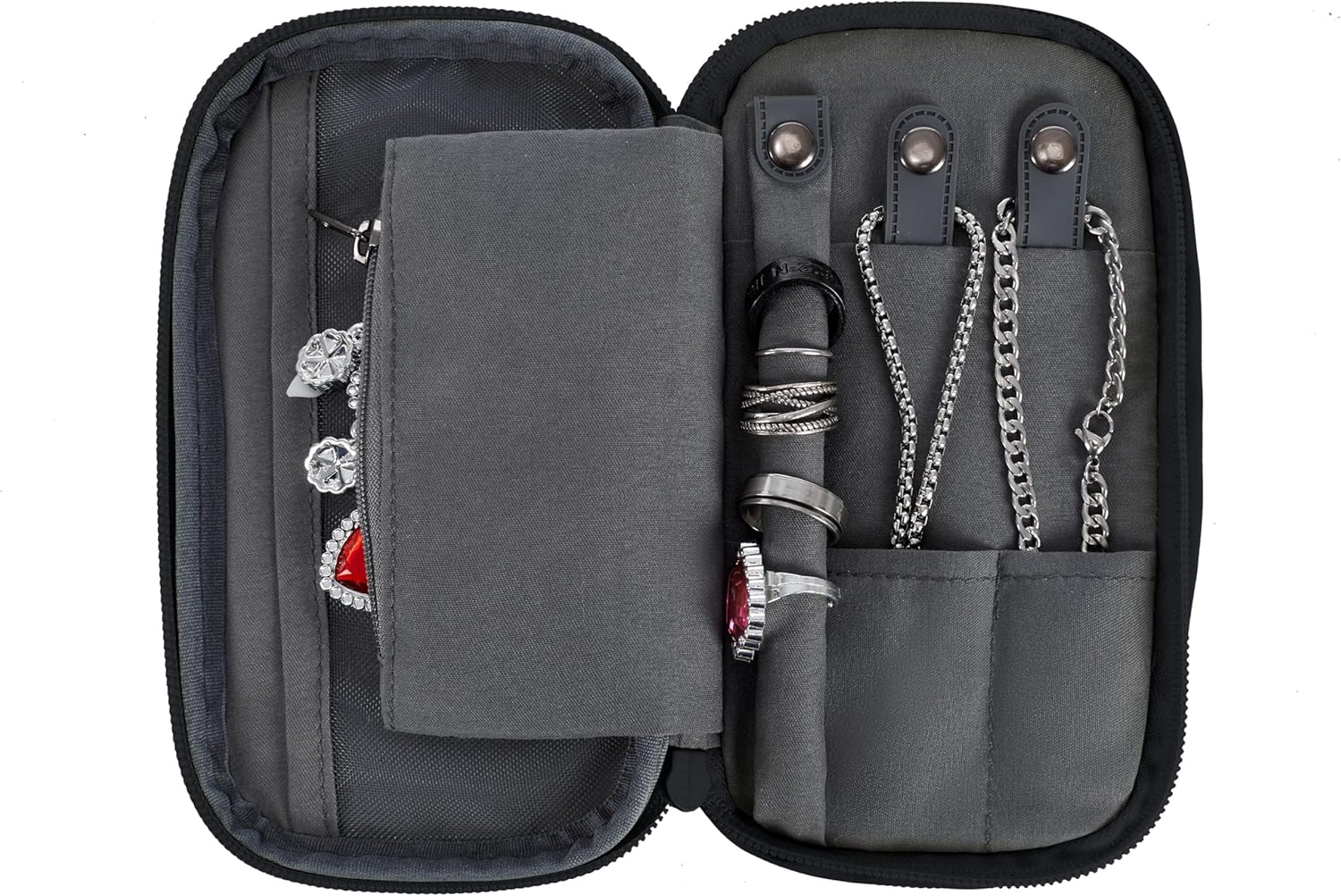 Featuring a sleek and compact design, this organizer is crafted from high-quality materials to ensure durability and longevity. The interior is lined with soft velvet to prevent scratches and damage to your jewelry, while the tech compartment is designed to safely store your gadgets such as earbuds, chargers, and smartwatches.